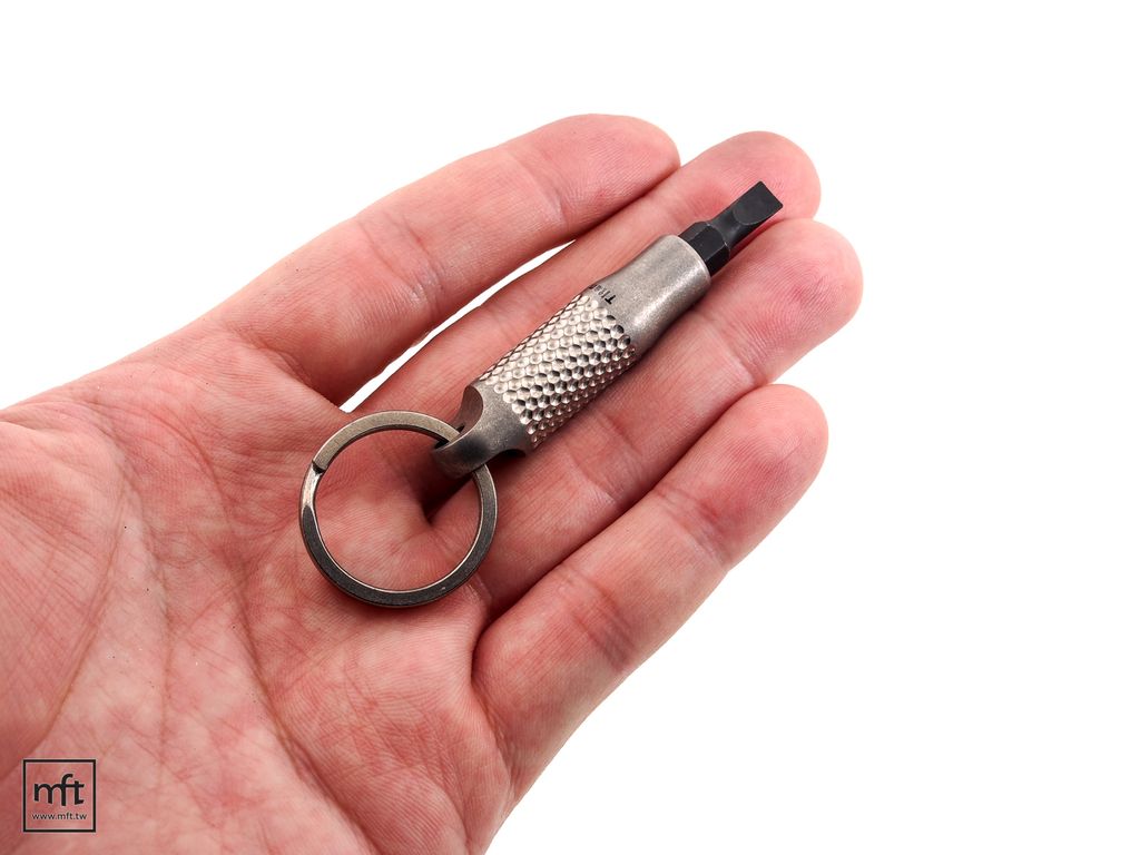 Nub Titanium Screwdriver搭配2個1/4吋HEX起子頭,本體的部份為鈦合金材質,內部有磁鐵,一字和十字起子頭放入後會吸住,本體表面處理成像是高爾夫球表面的小凹孔,提昇質感也提供防滑的效果。尾部鑽孔並附上一個鈦鑰匙圈環,除了用來與其他物件結合攜帶外,也可當做是握柄的延伸而更好施力。