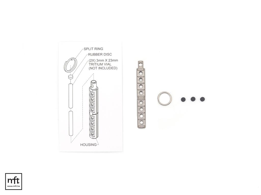 全名是TEC-T323-2X PRE (Picatinny Rail Edition),TEC-T323-2X是鈦合金材質製作而成的框體,需要安裝氚管後使用(需安裝兩隻3x22.5氚管),長度5.4公分,,裝上氚管後重量約4.9克,上方有鑰匙圈孔。