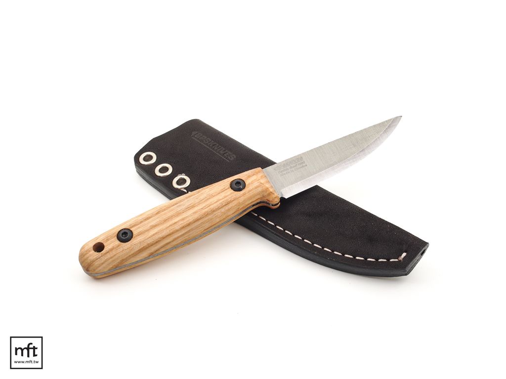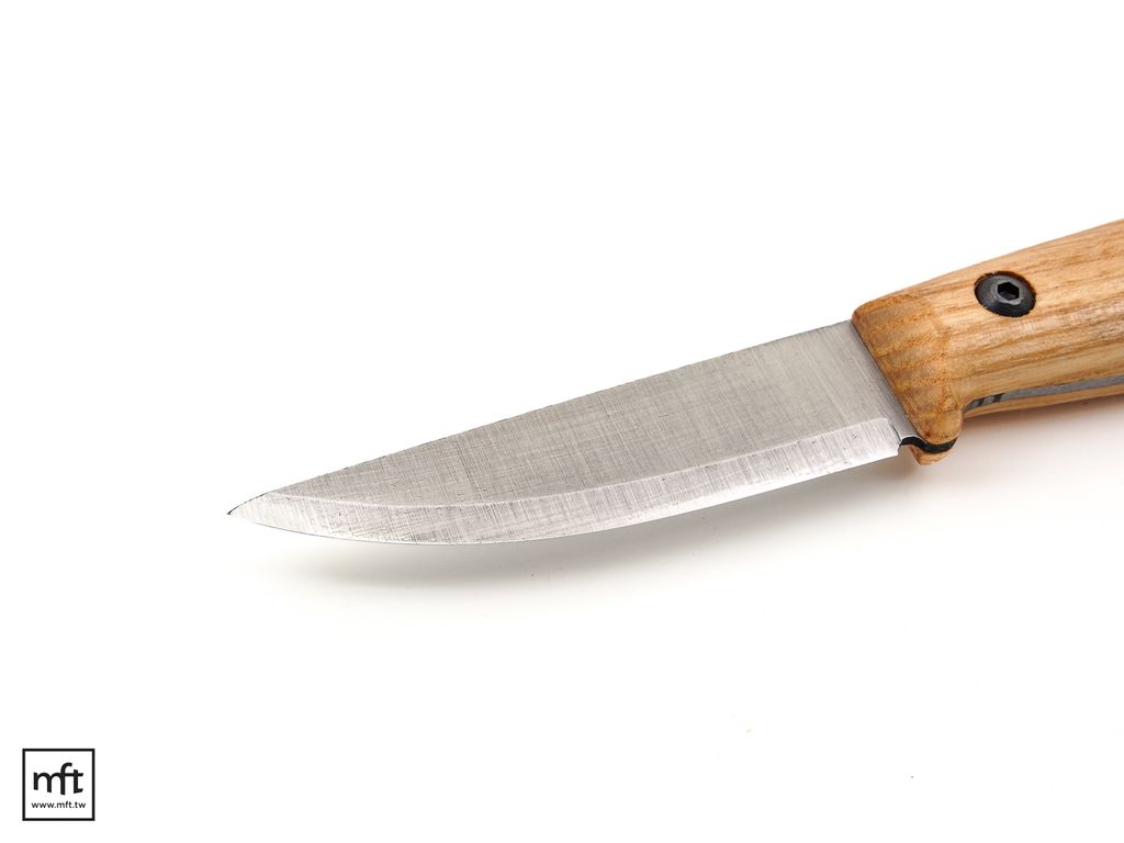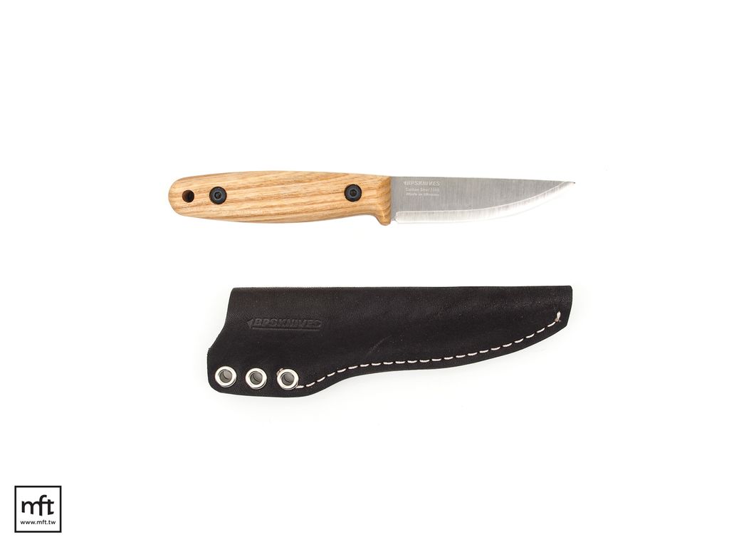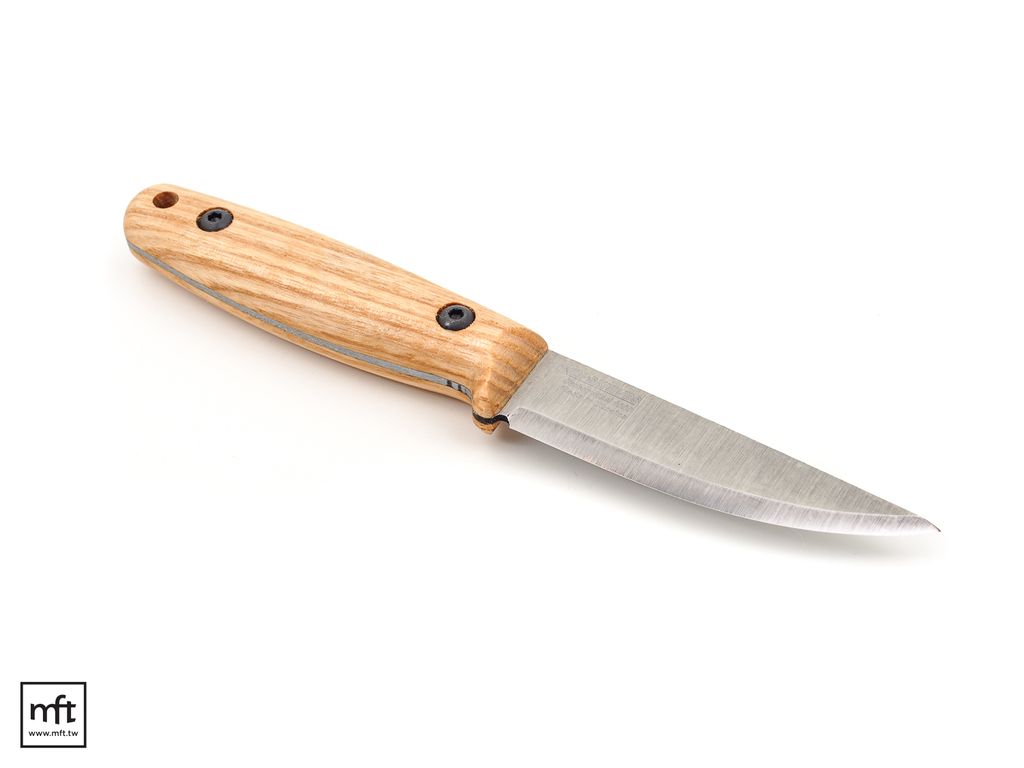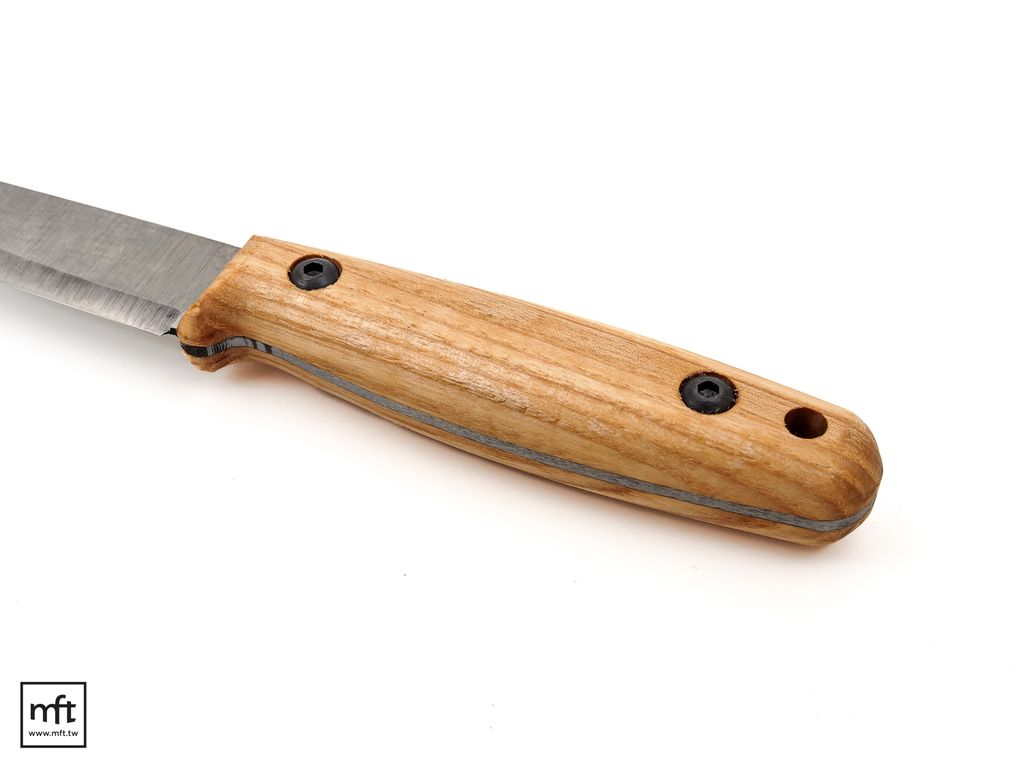 BPS Finn Lite的刃長只有8公分,是一款小尺寸的北歐刀,鋼材採用1066碳鋼,握柄片為白蠟木(Ash Wood)材質,Drop Point刃型,Scandi刃角。握柄片是以螺絲(內六角2.5mm)固定,可以自行解開螺絲進行刀刃的清潔保養,握柄尾端有尾繩孔,可自行添加尾繩。