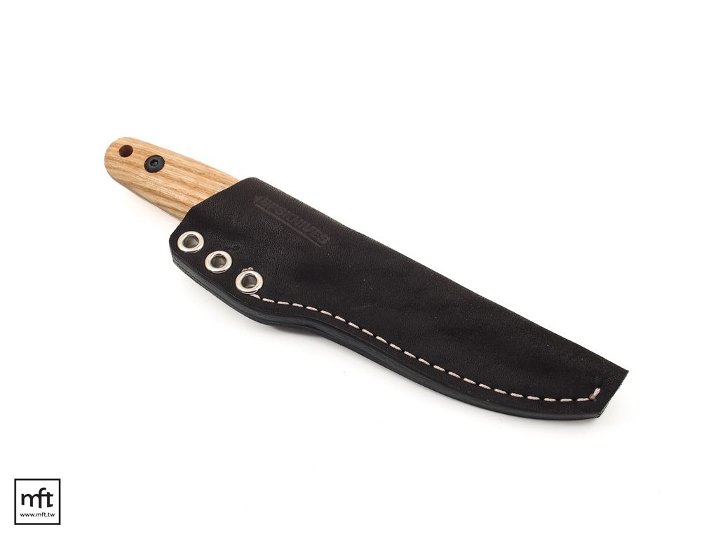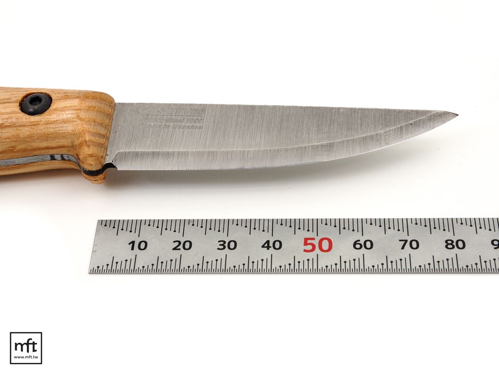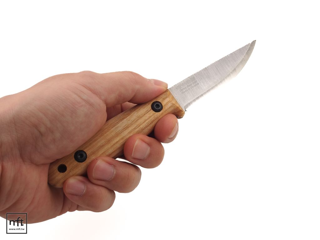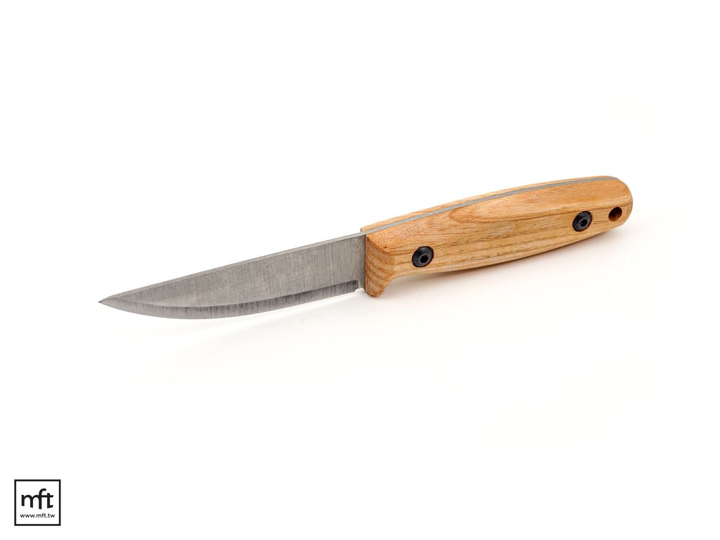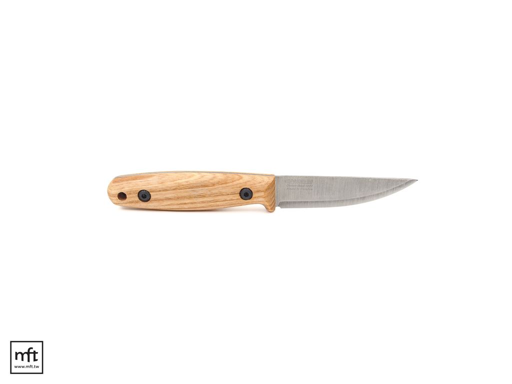 BPS Finn Lite的刃長只有8公分,是一款小尺寸的北歐刀,鋼材採用1066碳鋼,握柄片為白蠟木(Ash Wood)材質,Drop Point刃型,Scandi刃角。握柄片是以螺絲(內六角2.5mm)固定,可以自行解開螺絲進行刀刃的清潔保養,握柄尾端有尾繩孔,可自行添加尾繩。