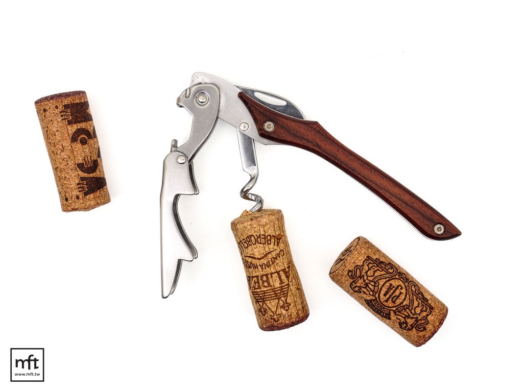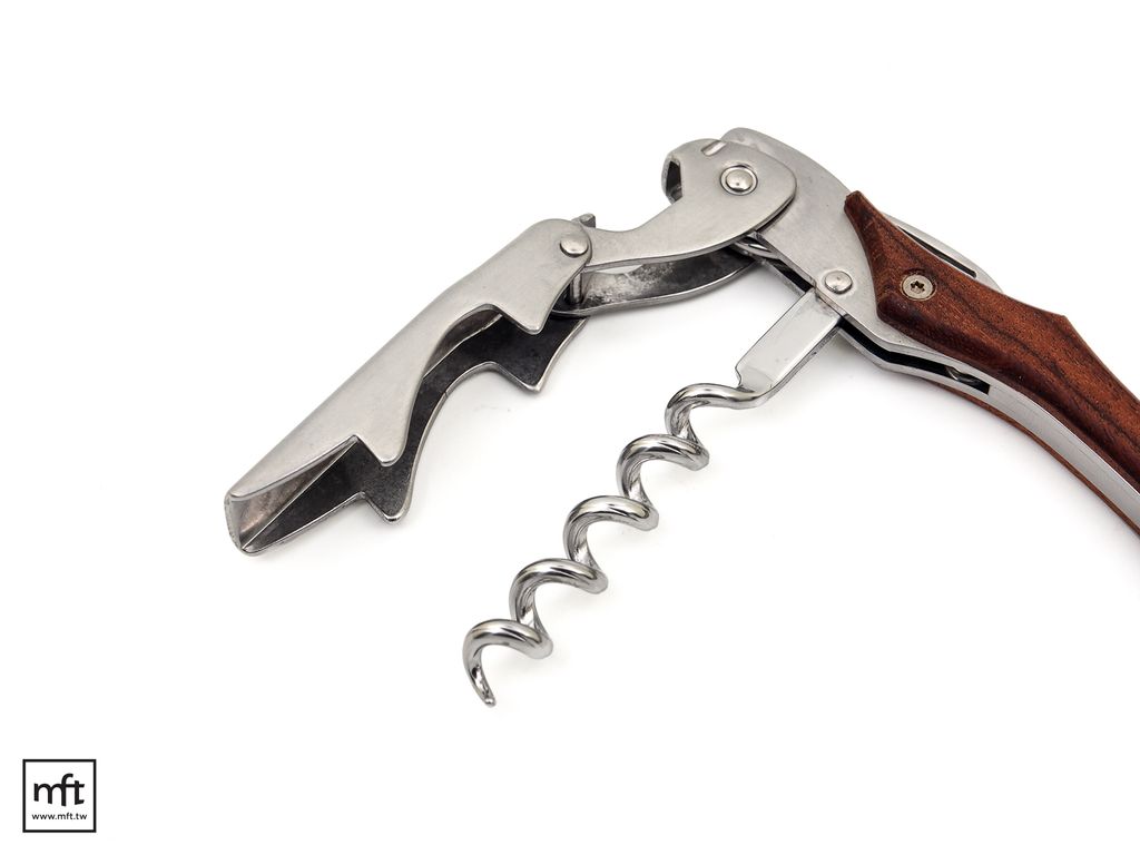 先用小鋸齒刀將酒瓶封帽切除,把螺旋鑽插入軟木塞,順時針旋轉,不要轉到底,留一圈螺旋,以第一段支撐點支撐於瓶口,提起握柄,拉起軟木塞。接著用第二段支撐點支撐於瓶口,再次提起握柄,慢慢將剩餘的軟木塞完全拔出。(可搭配參考影片示範)