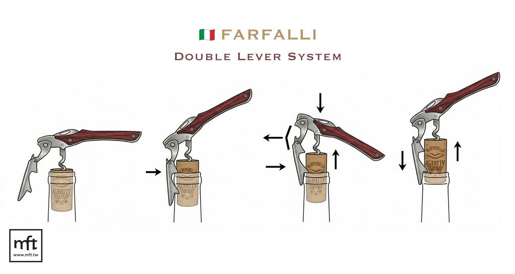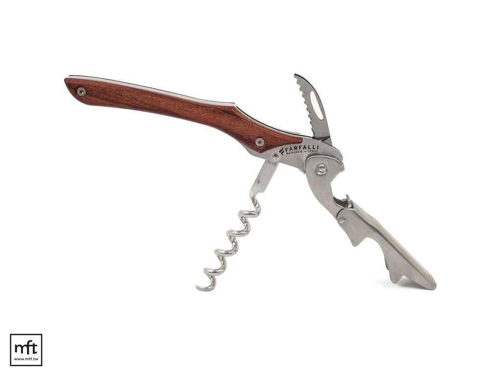 Farfalli的紅酒開瓶器,擁有多種獨家專利技術(像是著名的雙槓桿系統與長柄設計),並大膽採用現代化材料(鈦合金、碳纖維、鋁合金、及各類精選木材)與傳統工藝結合。