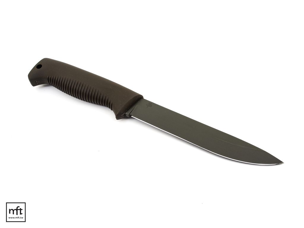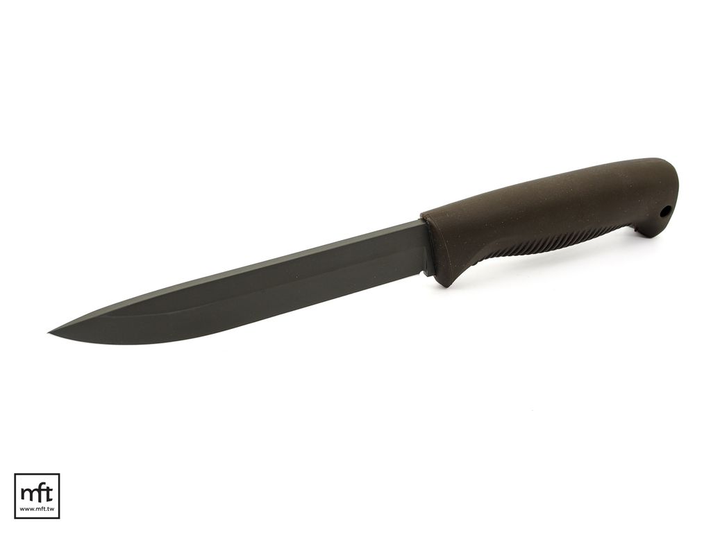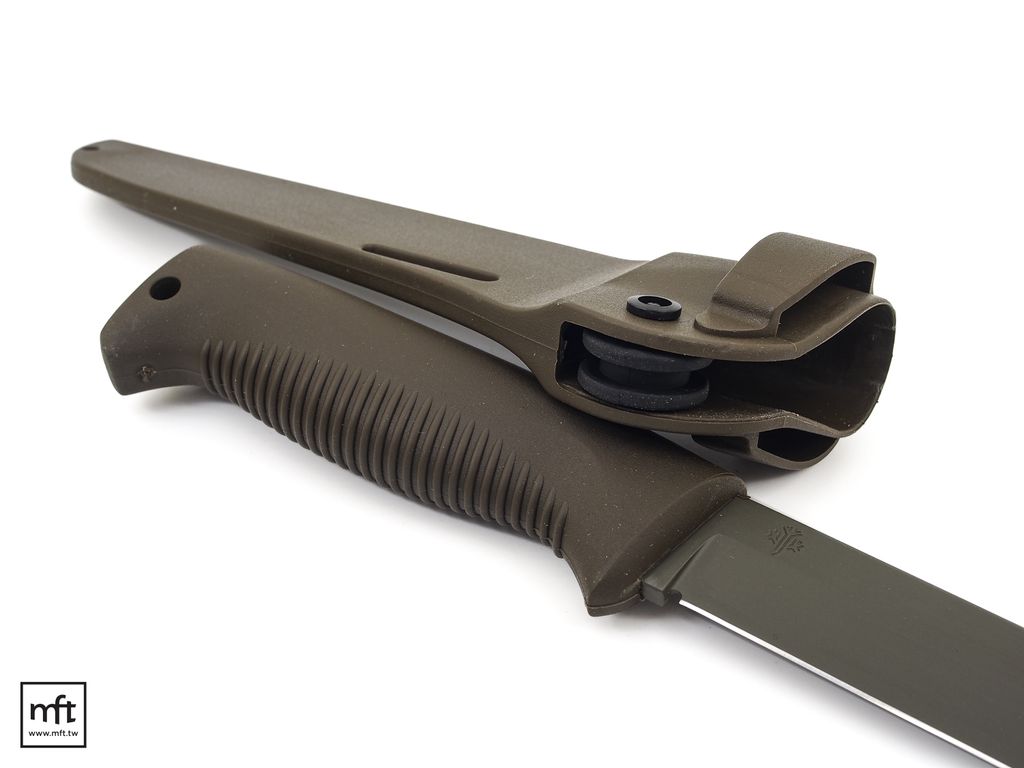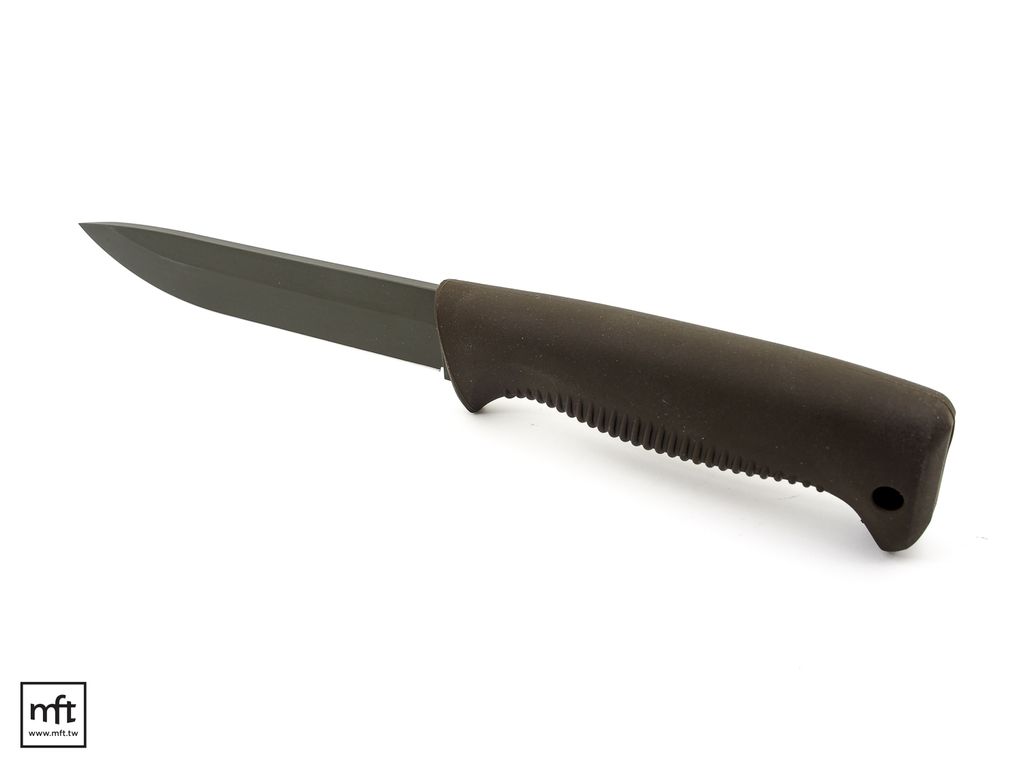 本款Sissipuukko M95採用80CrV2碳鋼鋼材,刃長15公分,刀刃厚度4.25mm,Drop Point刃型,Saber Grind刃角,刀刃為Cerakote塗層的版本(OD深綠色)。