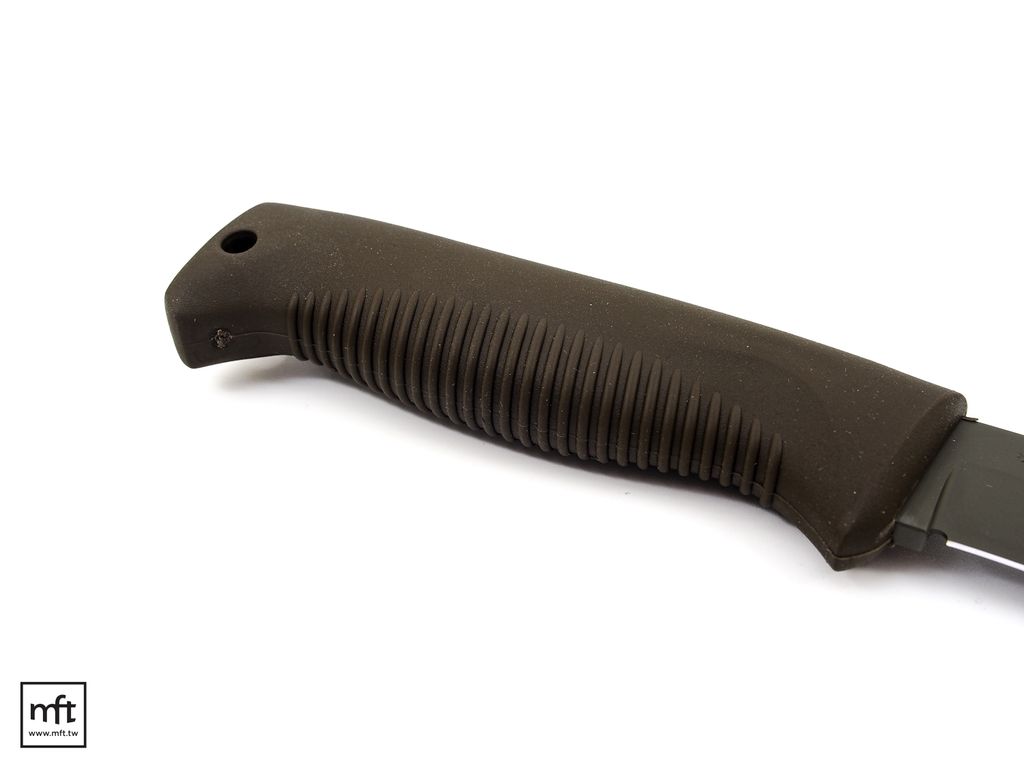 握柄的部份為TPE (Thermoplastic Elastomer)材質,顏色也是OD深綠色,底部有防滑紋路,整體防滑效果非常好,乍看之下M95好像類似Mora是Rat Tang刀根,但實際上它是Full Tang全刀根,刀根是完整的貫穿到握柄的最尾端,因此強度跟一般Full Tang直刀沒有差異。曾經有人詢問J.P. Peltonen為何不將刀根的尾端露出來,這樣就可以提供刀尾撞擊的功能,但考慮到有些人會因此濫用刀尾做鎚擊而導致刀子受損,因此他沒有做這樣的設計。