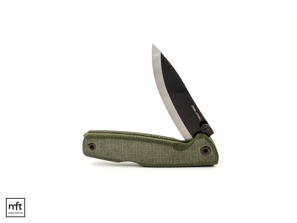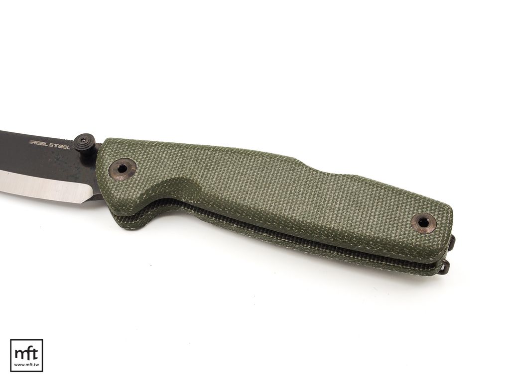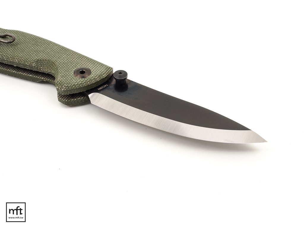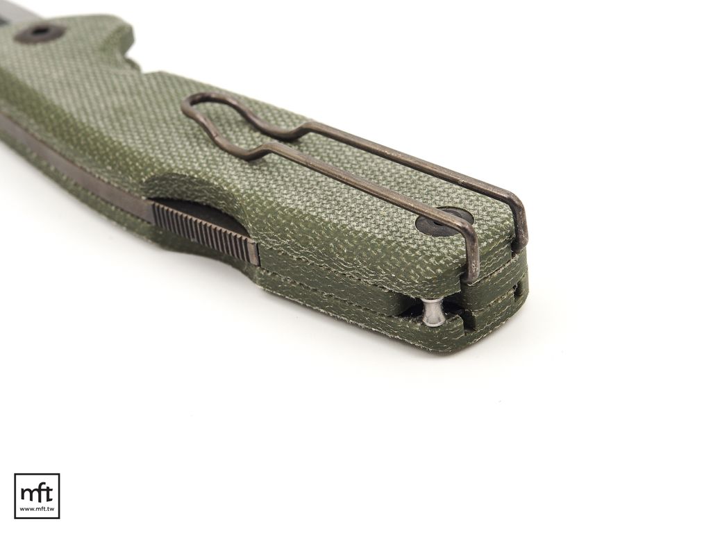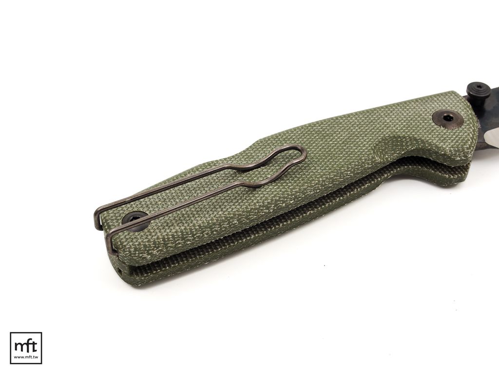 鐵線型的深式背夾可以左右兩側互換安裝,因此算是對左右手都友善的折刀。握柄尾部還有一個隱藏式的繩尾孔,可自行繫上尾繩。Micarta材質握柄,表面略保留粗粗的顆粒感,能夠達到防滑的功效,拇指前端有凸出的護手造型設計。