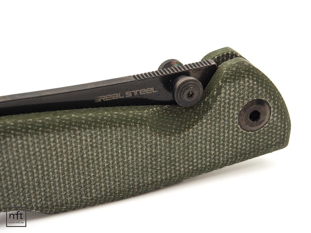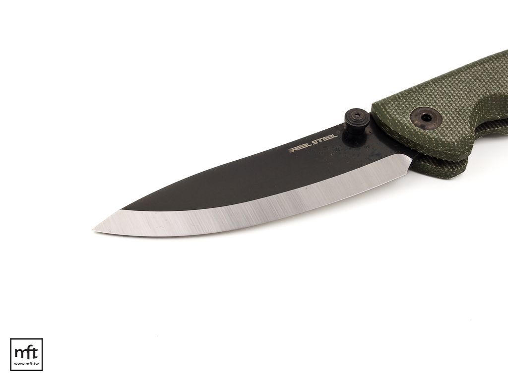 Real Steel Yak折刀採用14C28N鋼材,刃面有經過PVD黑化處理 ,Drop Point刃型(帶有一點Nessmuk的味道)搭配Scandi刃角,刃長9.4公分,以尺寸來說算是中尺寸的折刀,握柄長度也頗長,中等手掌滿握還會多一指的寬度,所以即使是帶手套操作也不會太過侷促。Lock Back鎖定,兩側皆有拇指鈕,拇指鈕相當大顆,也是為了戴手套好操作所做的設定。