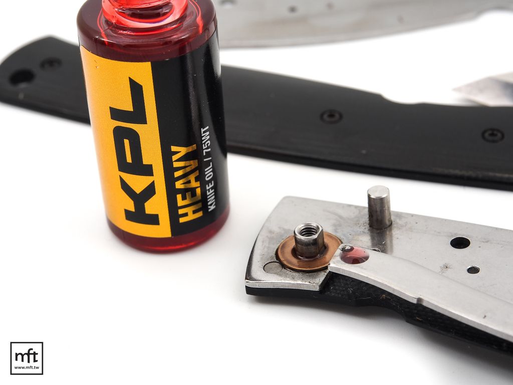 2️⃣點一兩滴到需要潤滑的部位,若是針對折刀轉軸,在不拆解刀子的狀態下,可以直接從側邊點油到轉軸處,左右各一兩滴,之後開合數次即完成潤滑動作。