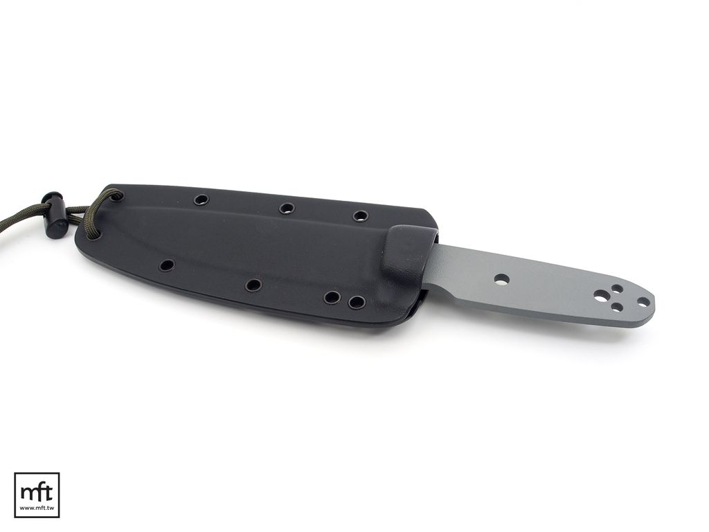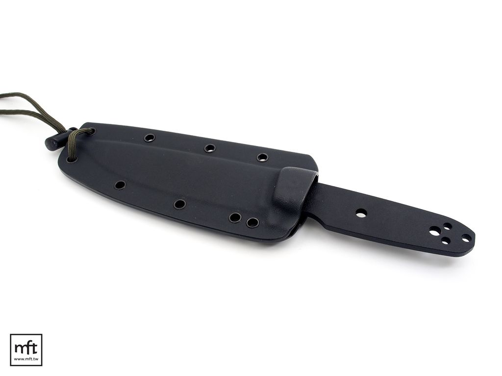 2. Kydex刀鞘是以成刀(安裝握柄)當做開模依據,所以會有一個區域是握柄厚度的空區(視覺上看起來會有點怪),但因為卡緊的區域是在護手的位置,所以即便是沒有握柄的狀態下,刀子卡進去Kydex刀鞘後是緊的。