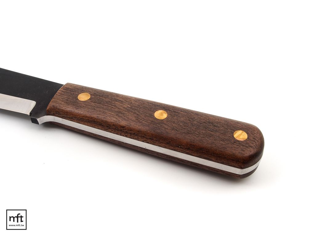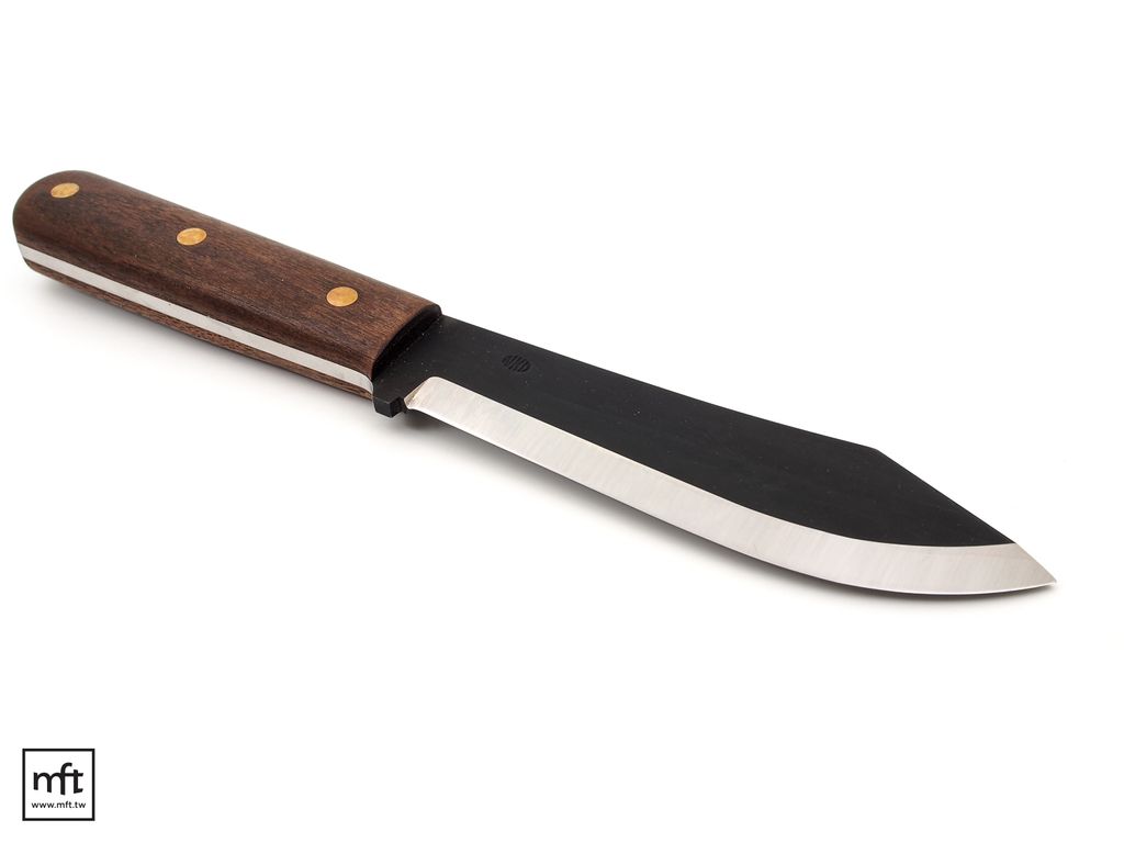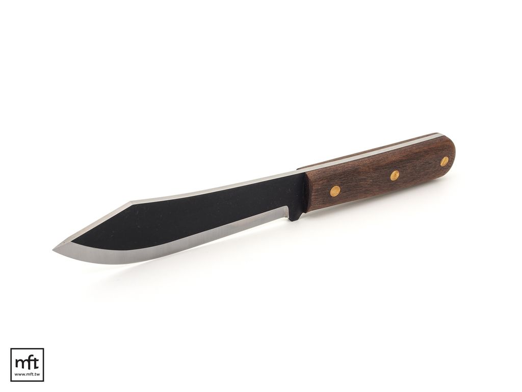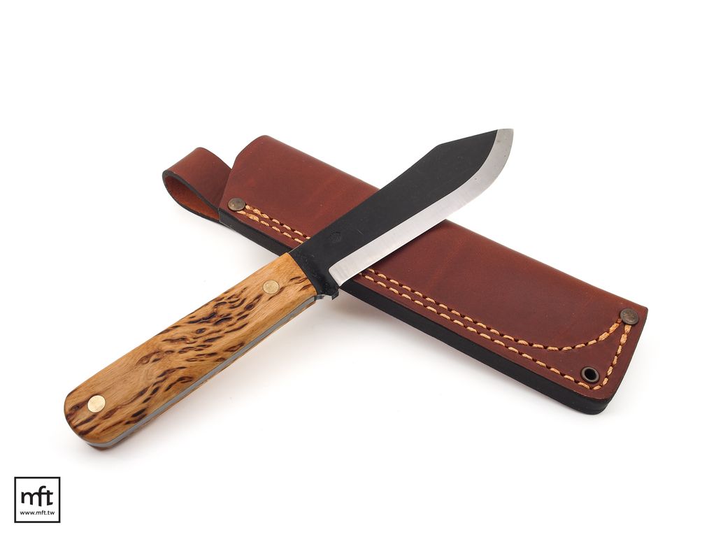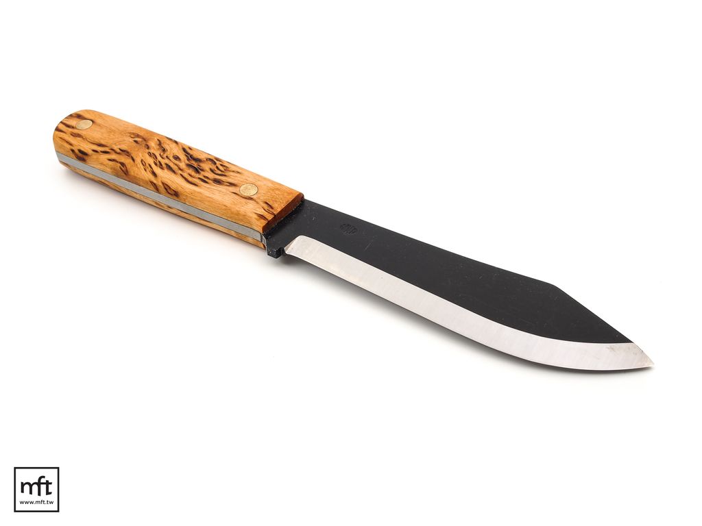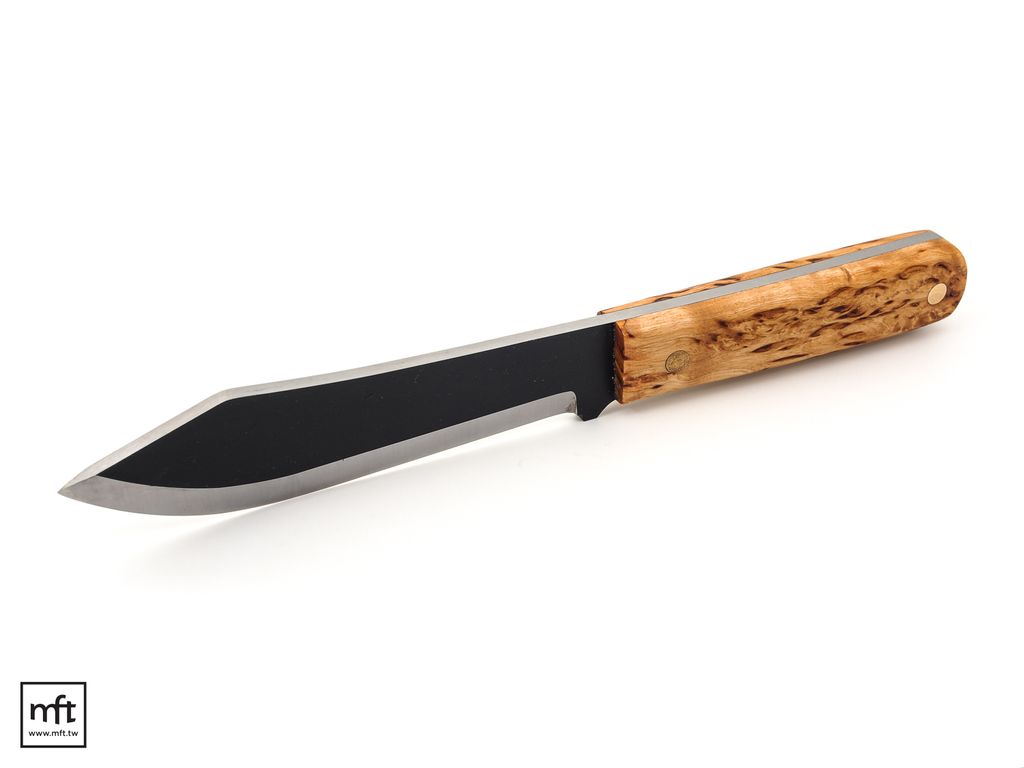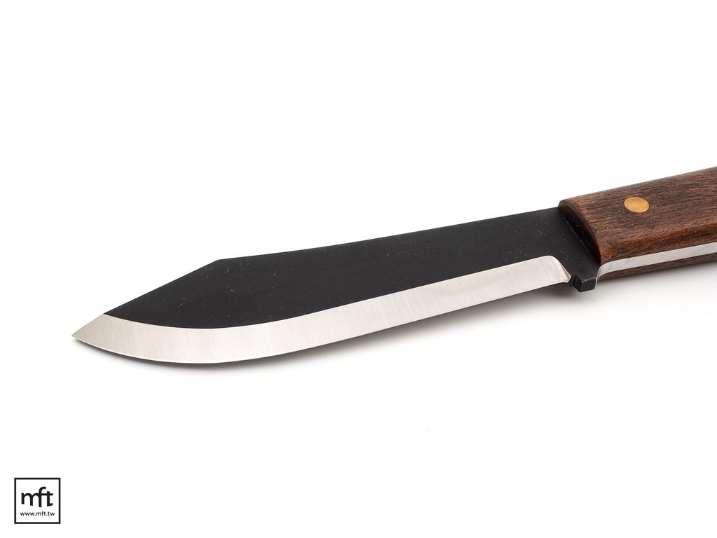 刀刃表面為較粗礦的染黑處理,成刀版本刀背的部份已將黑色部分磨除,可以直接用來當做打火棒的刮刀。刀刃相當銳利,不論是切割或是小範圍砍劈都可以勝任。