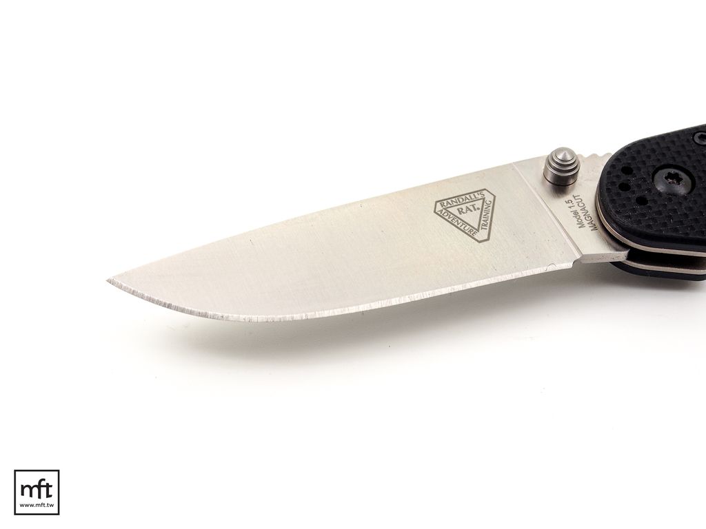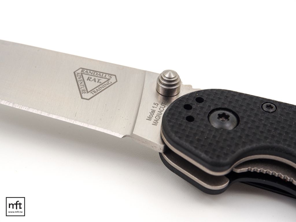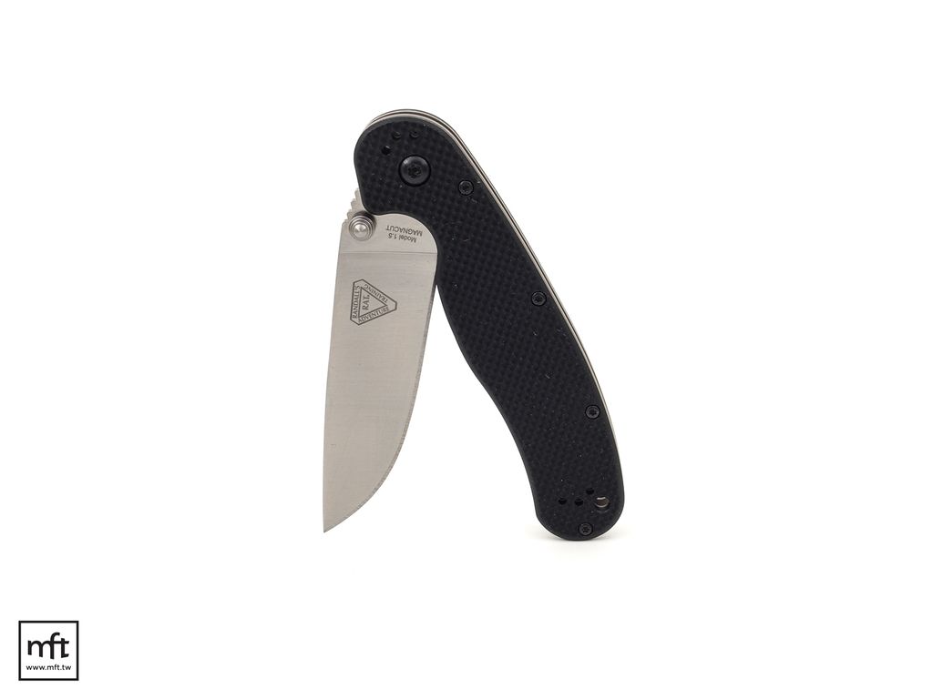本款RAT 1.5 / MagnaCut,採用這幾年很熱門的MagnaCut不鏽鋼,而數字1.5則是表明了刀子的尺寸是介於RAT 1與Rat 2之間,也就是比RAT 1小一點比RAT 2大一些。握柄的部份則是採用G10材質,表面紋路的觸感明顯,防滑的效果與質感較一般版的Nylon 6要好上許多。