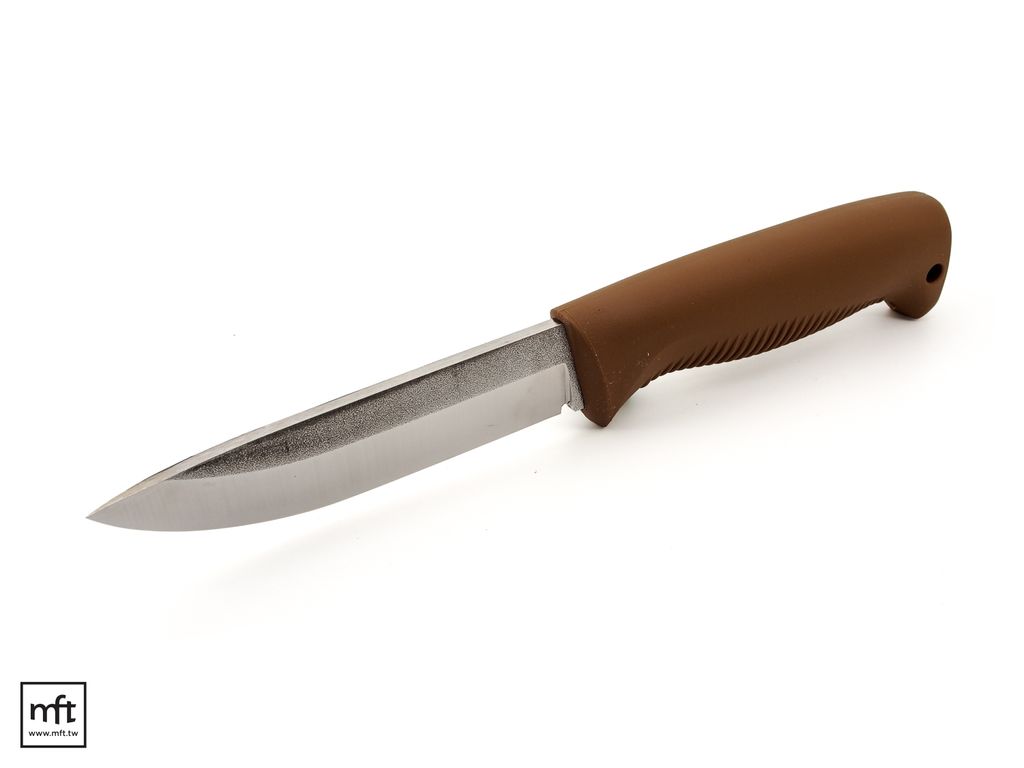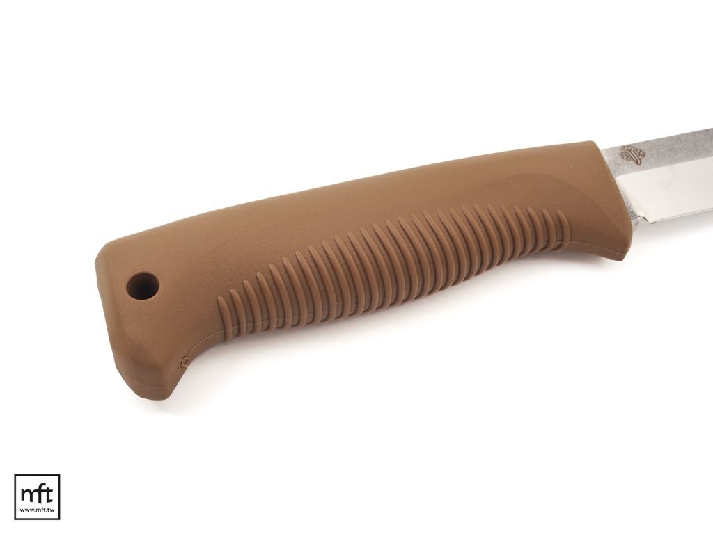 握柄的部份為TPE (Thermoplastic Elastomer)材質,底部有防滑紋路,整體防滑效果非常好,乍看之下M07好像類似Mora是Rat Tang刀根,但實際上它是Full Tang全刀根,刀根是完整的貫穿到握柄的最尾端,因此強度跟一般Full Tang直刀沒有差異。曾經有人詢問J.P. Peltonen為何不將刀根的尾端露出來,這樣就可以提供刀尾撞擊的功能,但考慮到有些人會因此濫用刀尾做鎚擊而導致刀子受損,因此他沒有做這樣的設計。