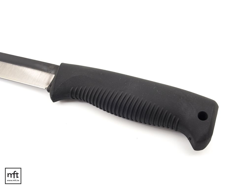 握柄的部份為TPE (Thermoplastic Elastomer)材質,底部有防滑紋路,整體防滑效果非常好,乍看之下M95好像類似Mora是Rat Tang刀根,但實際上它是Full Tang全刀根,刀根是完整的貫穿到握柄的最尾端,因此強度跟一般Full Tang直刀沒有差異。曾經有人詢問J.P. Peltonen為何不將刀根的尾端露出來,這樣就可以提供刀尾撞擊的功能,但考慮到有些人會因此濫用刀尾做鎚擊而導致刀子受損,因此他沒有做這樣的設計。