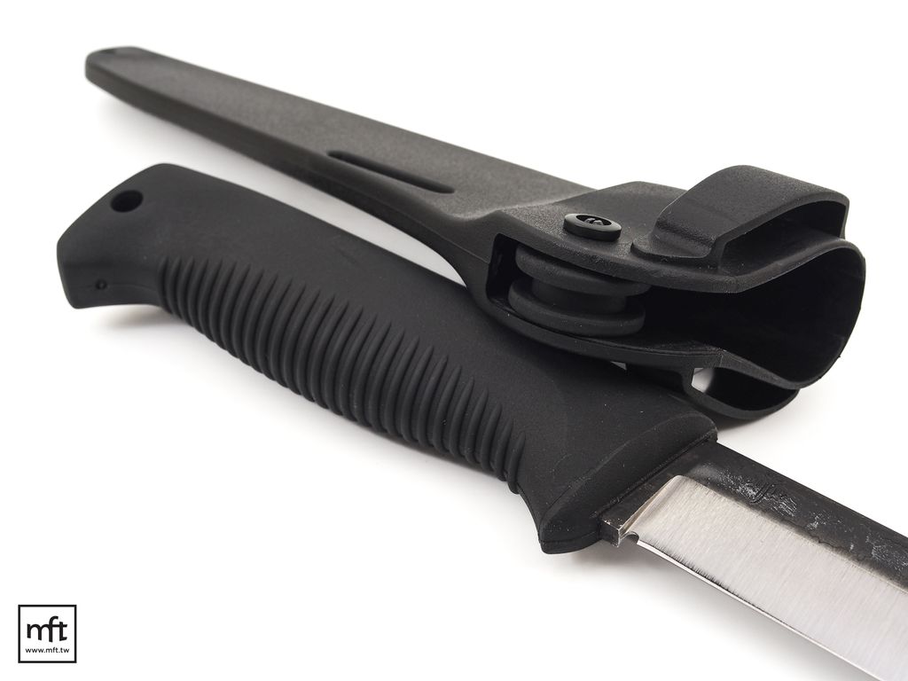 刀鞘的設計是讓Sissipuukko M95加分的重要關鍵,刀鞘是複合塑膠材質(Composite Sheath),以高品質的聚丙烯混合添加劑來增加彈性與耐用度,隨附一條魔鬼氈綁帶,穿過刀鞘上的長孔,可以用來將刀鞘與Molle系統的織帶結合,穿過刀鞘兩側的耳朵,則可以當做皮帶環。刀鞘內側有一個彈性橡膠輪,當刀子放入刀鞘後可以將其固定住,即時是刀鞘反轉安裝的情況,或是劇烈活動中,刀子也不會自己從刀鞘脫落,這個結構稱作Easylock系統。刀鞘口上方的魚鰭狀凸起,則是在收刀與抽刀的時候,提供拇指推拉的支撐點。
