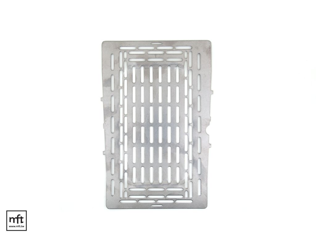 放置在5吋爐上的小烤盤,兩邊有凸出點可以卡入爐子,由於爐子俯視是不對秤的矩形,本配件有分正反面,安裝時請將T字符號的那面朝上。舊版:在中央的位置有一塊凹壓的區域,是為了減少鈦金屬熱變形刻意壓凹的。🔥烤盤請勿長時間空燒,否則將導致變形。