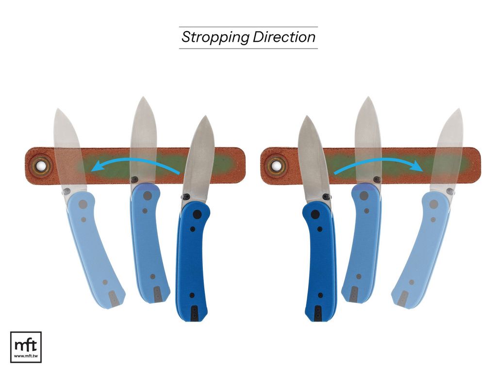 深色面(印Logo那面)為平滑表皮,淺色面為粗糙表皮。由於皮面尺寸較小,請將磨刀板放置在平面桌子的邊緣,將綠色研磨劑塗抹在皮革表面,將刃口抵柱磨刀板(角度要抓一下),左側刃口抵住皮革,由右邊往左磨,右側刃口抵住皮革,由左邊往右磨(請參考圖2的施力方向圖解,或是參考影片),刀刃的兩面研磨次數一致,來回研磨幾次即可測試銳利度。