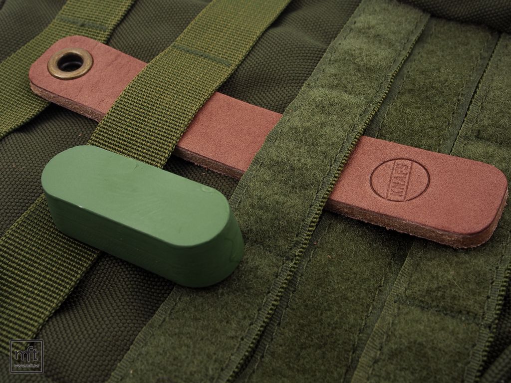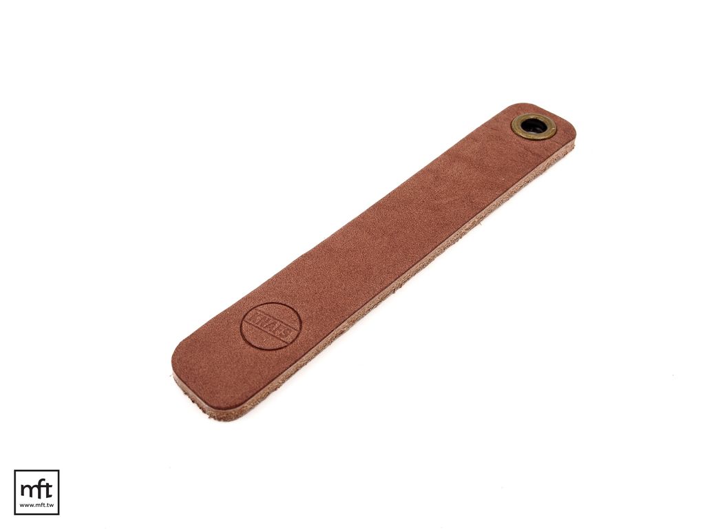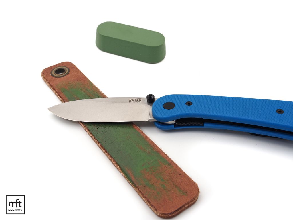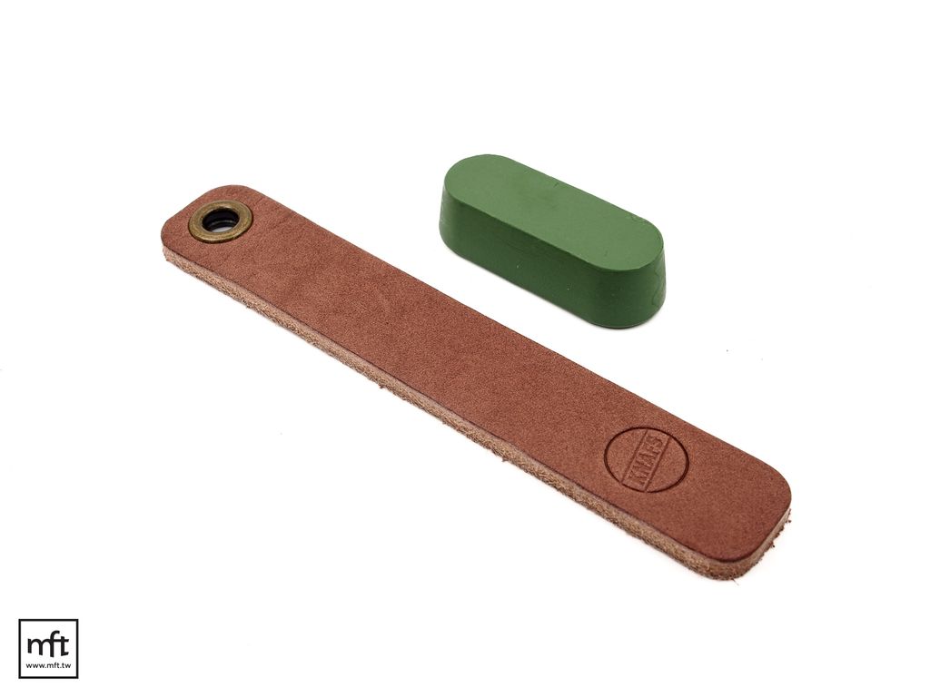 KNAFS這款皮革磨刀板,主要是設計給尺寸較小的刀子使用,例如小頸刀與折刀,皮面尺寸大約15 x 2.5公分,方便攜帶,尺寸雖小,但採用相當厚的皮革為材料,皮面的一端安裝一個氣眼孔,可用來掛扣。另外附一顆綠色研磨劑(Strop Compound)。