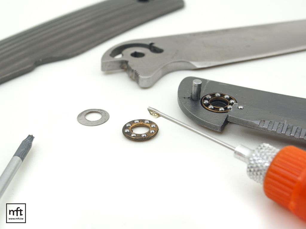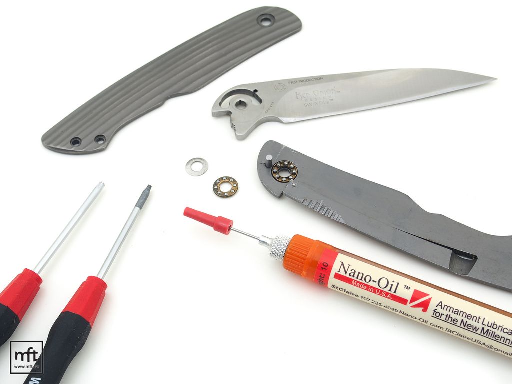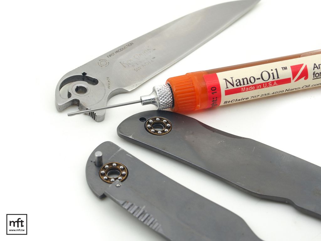 如果你有拆解折刀的能力,可以將折刀完全拆解後,把原本留在刀刃,刀柄以及華司上的油與髒汙都清潔擦乾淨,再點上一些Nano-Oil在轉軸的部位上,組裝好後一樣是開關折刀數次即可。